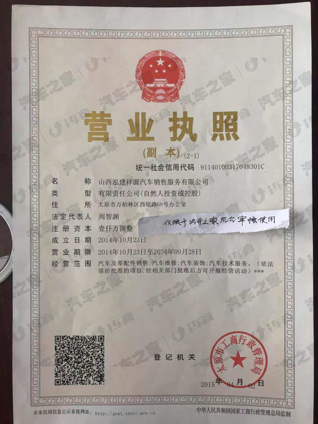 山西泓建祥源汽车销售服务有限公司成立于2014年,是北京汽车在山西省授权经营的旗舰店,是一家集新车销售、售后维修、汽车零配件供应、汽车装潢、二手置换和信息反馈于一体的旗舰级4S店。公司主要经营绅宝绅宝X35、绅宝D50、绅宝智行、绅宝智道、BJ40LPLUS、BJ80等北汽生产的系列车型。(由于公司发展好,服务好,我店在北京也有2家4S店,不管是从销售还是售后的服务,都是值得你去托付的港湾。)