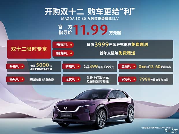 今年,请将目光投向能真正升级出行体验、定义未来生活方式的座驾——长安 马自达全新力作 MAZDA EZ-60。我们诚邀您把握年度 佳购车时机,即日起至12.12期间,下订EZ-60,即可解锁“给利”无穷的专属礼遇,多重惊喜 好礼免费赠送,助您轻松驰骋,智享未来。