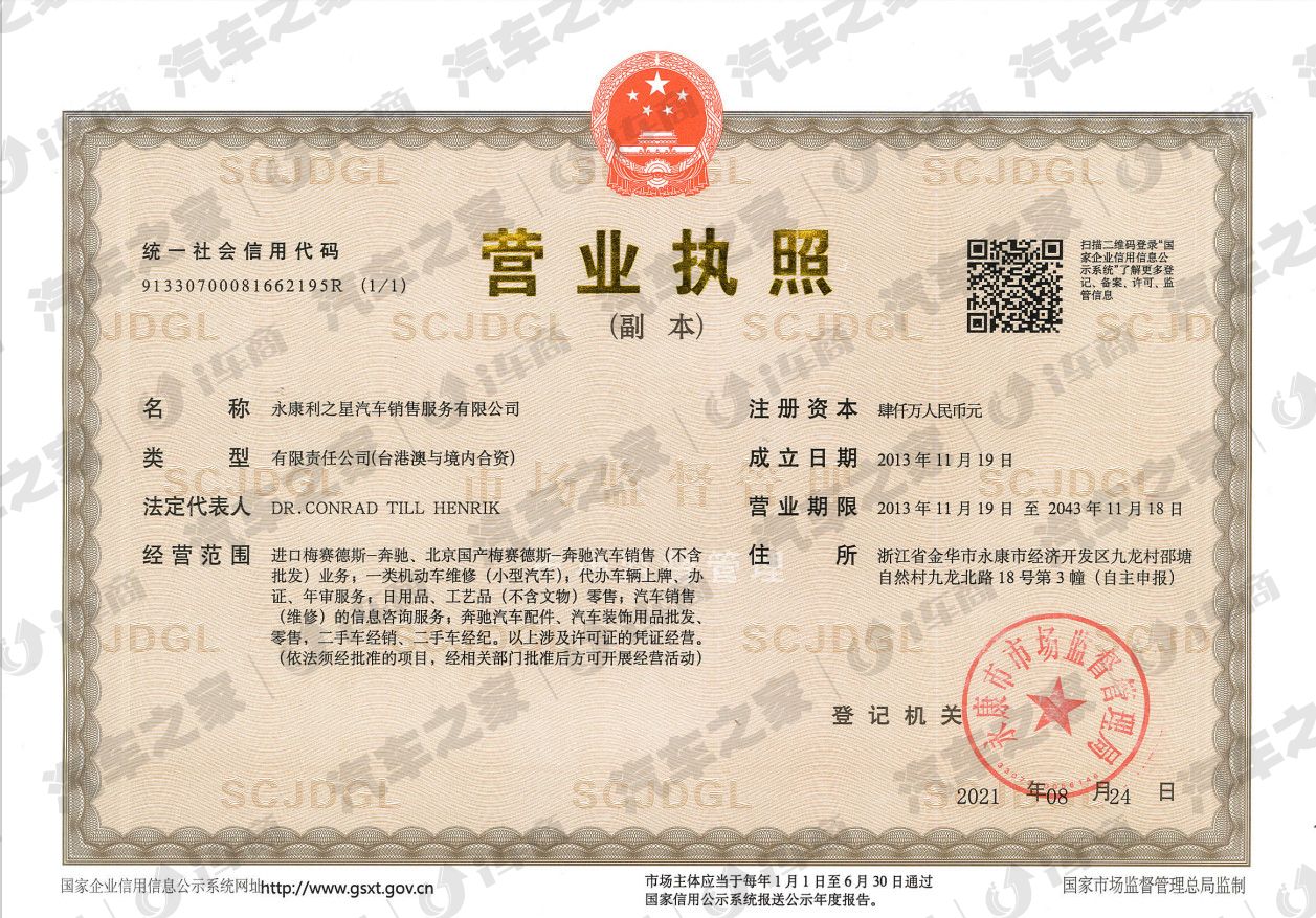 永康利之星成立于2016年2月2日,是利星行集团成员。利星行汽车进入中国市场二十多年来,专注于豪华品牌汽车服务,经销网络已经遍布全国82个城市。为给客户带来更好的体验,我们致力于提供多样化的产品和服务,以满足客户的不同需求。永康利之星隶属于在全国拥有上百家梅赛德斯-奔驰4S店的香港利星行集团,座落于永康经济开发区邵塘村九龙北路18号,是一家集汽车销售、零配件供应、维修服务、信息反馈于一体的拥有外资性质的梅赛德斯-奔驰授权经销商,同时也是梅赛德斯-奔驰梦车授权经销商,工作人员均经过厂方严格的培训和认证,秉承梅赛德斯-奔驰“星徽理念”,致力于为永康的梅赛德斯-奔驰消费者提供专业、尊贵的服务,让您在选车、用车、保养、维修等各环节均享受来自德国统一的专业服务。