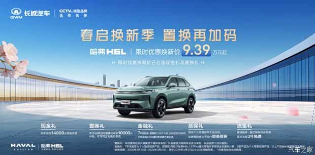 春分将至,万物复苏。对于许多家庭而言,一辆能承载全家出行需求、让旅途更舒适的SUV,正是开启春日旅程的“最佳搭档”。近日,哈弗H6L限时购车政策再加码:3月13日至3月31日,限时优惠换新价低至9.39万元起(已包含现金礼14000元及置换礼10000元)。当诚意十足的购车政策,遇上产品力全面进阶的哈弗H6L,一场关于“换新出发”的春日叙事就此展开。