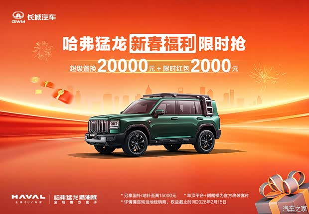 现金礼:限时下订即享20000元现金优惠,再享受新春福利限时红包2000元。