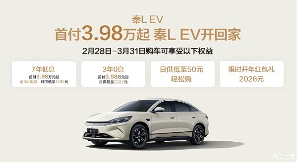 马年新春,2026款秦L官宣超级金融政策,即日起至3月31日24:00前完成购车开票的消费者,即可享受7年低息、3年0息等权益,首付3.98万元起,日供低至35元,轻松入手中级家轿,限时再送2026元开年红包礼,陪伴消费者开启新年的全新出行体验。
