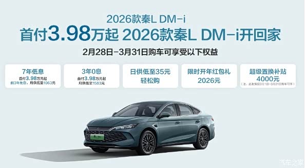 此外3月1日-3月31日入手2026款秦L DM-i还可享受4000元限时超级置换补贴。