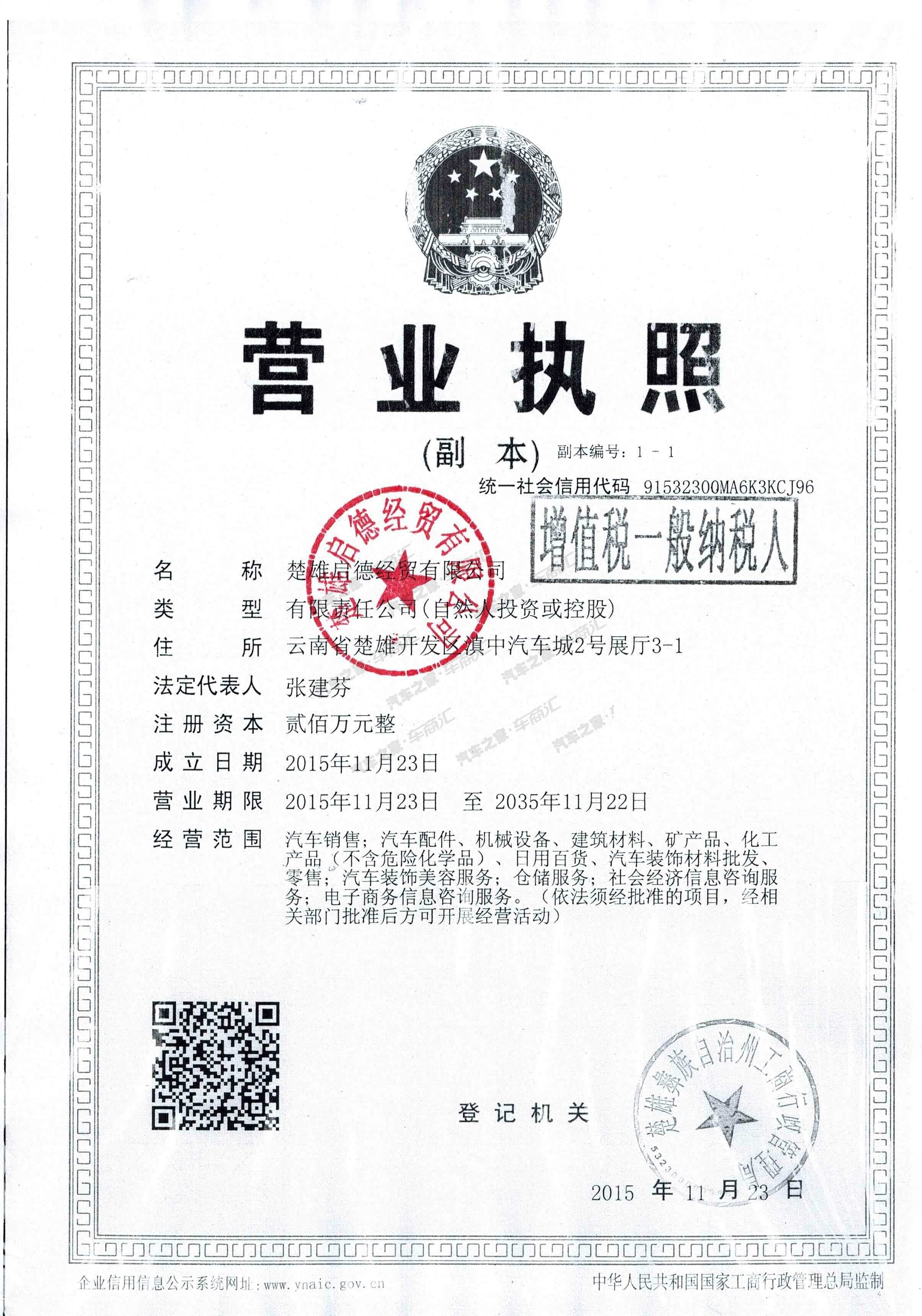 楚雄启德经贸有限公司成立于2015年11月,注册资本200万元,云南商务集团下属地州分公司,是楚雄州唯一一家标准化奇瑞4S店。公司秉承“以一流的服务、创一流的企业”的奋斗目标。在公司自身不断发展壮大的同时、一直致力于给客户提供更优质、更高效服务及交流平台。公司拥有宽敞、明亮的车辆展示区域,温馨舒适的购车环境,在职员工20多人,占地面积1500平,强大高效的售后队伍能为车主提供全天24小时的紧急维修及救援服务、同时还可以提供二手车置换、新车按揭等车辆业务,让更多的客户能够体验到商务人服务至上的理念承诺。在奇瑞汽车产品品质不断提升的同时云南商务集团楚雄启德奇瑞4S店的服务质量也大幅提升。