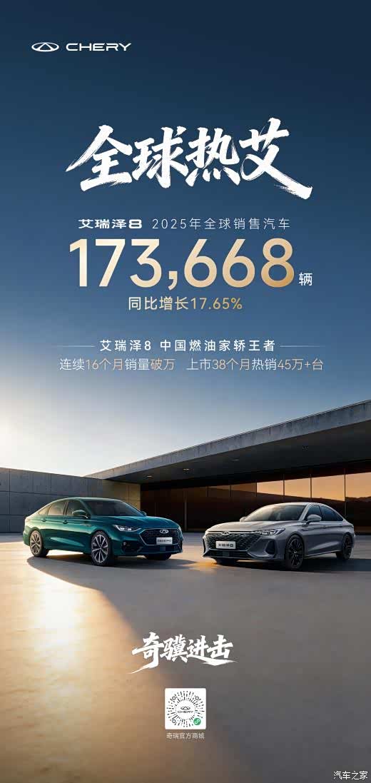 2025年,艾瑞泽8家族以全球销量173668辆、同比劲增17.65%的硬核战绩圆满收官;自上市以来,家族38个月累计销量突破45万辆,更创下连续16个月销量破万的行业佳绩,在竞争激烈的市场红海稳立潮头。艾瑞泽8家族的成功并非偶然,在同质化竞争激烈的家轿市场,家族通过艾瑞泽8与艾瑞泽8 双线布局,全面覆盖家庭实用、运动性能等多元化需求,持续吸引年轻消费群体。这种快速响应市场的进化能力与精准的市场布局,正是其赢得全球用户青睐的关键所在。