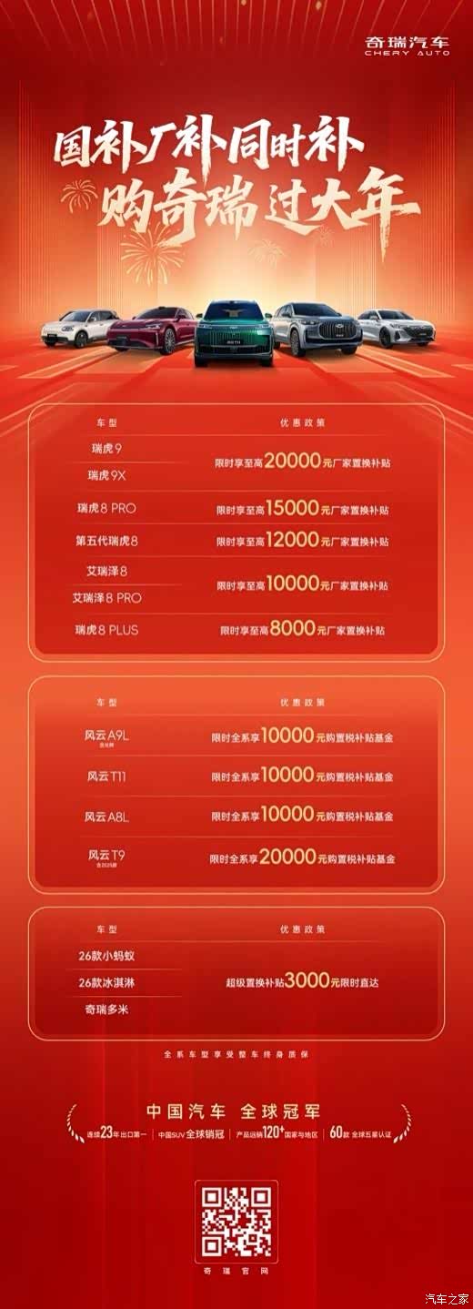 细分车型来看,燃油车领域福利力度空前。瑞虎家族推出至高20000元置换补贴,大幅降低消费者换购门槛;备受市场青睐的艾瑞泽8家族,限时释放至高10000元厂家补贴,进一步放大其在A+级家轿市场的优势地位。新能源阵营同样诚意拉满,风云系列至高可享20000元购置税补贴基金,助力绿色出行升级。、冰淇淋等热门都市代步车型,同步推出3000元限时补贴,持续降低城市通勤群体的购车成本。值得关注的是,上述厂家补贴可与国家补贴政策叠加使用。同时,奇瑞还将通过全系整车终身质保,为用户提供全方位的用车保障,打消后顾之忧。
