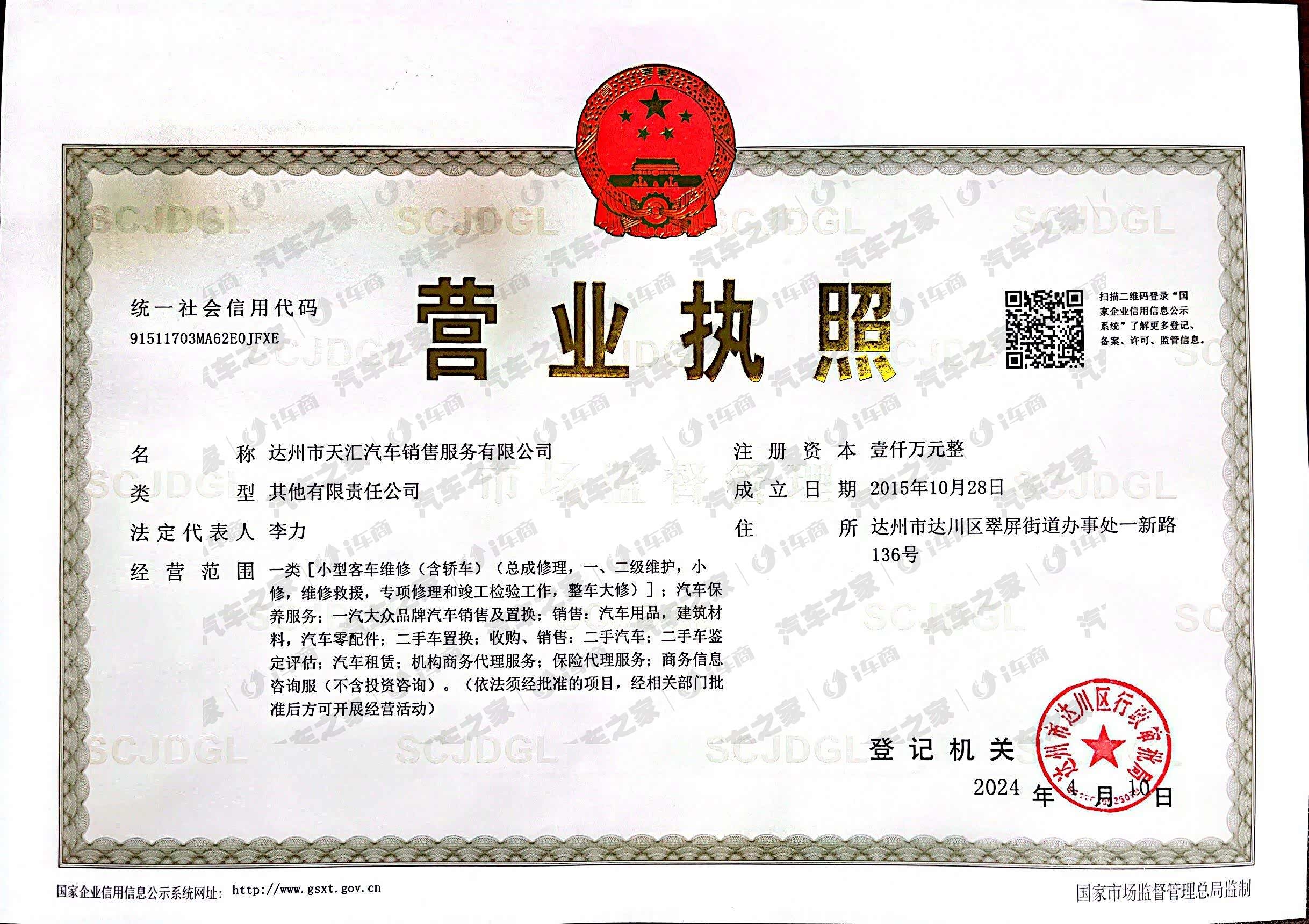 达州天马汽车经过多年的奋斗和努力,目前已发展成为集团公司的格局。集团拥有多个独立经济实体,分别是四川省达州天马汽车销售服务有限公司、达州市天马贸易有限公司、达州天马投资有限责任公司、达州梁材汽车销售服务有限公司、达州市鸿杉汽车贸易有限价公司、达州市天汇汽车销售服务有限公司和达州市天马吉祥汽车驾驶学校等。整个集团公司,总占地面积约120余亩,年销售汽车近3000辆,年营业收入约3亿元,属达州市汽车行业龙头企业。