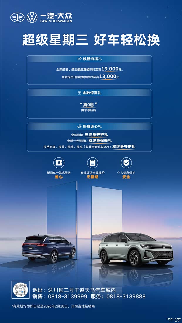 #超级星期三 好车轻松换# “同款旧车,在一汽大众 4S 店估价居然比二手车商高 8000?” 近期车主群里,这份周三专属的换车惊喜持续刷屏!一汽大众每周三「超级星期三」置换专场,正掀起一场旧车焕新风暴 —— 超高额置换补贴 + 一站式省心服务,让众多车主慕名到店、排队焕新。今天就为你彻底解密,这场爆款置换活动背后的多重惊喜福利! 专业置换精算师,焕新顾虑全打消 “旧车能抵多少?”“置换流程麻不麻烦?” 这两大换车核心顾虑,在本次置换专场统统迎刃而解!一汽大众以专业实力,打造透明、省心、高性价比的置换体验,给你实打实的焕新保障: 免费精准评估:专业评估团队,科学检测、报价透明,不压价、不虚标 多重补贴叠加:高额置换补贴 + 门店专属优惠,优惠金额清晰可见,福利享不停 一站式全程办妥:从旧车评估、过户到新车提车,全流程专人跟进,不用跑多趟,省心焕新 不止焕新好车,全家惊喜礼享不停 我们深知,每一次换车决策,都藏着对家人的用心。本次专场特为车主全家定制多重礼遇,让焕新的快乐,全家共享: 到店礼:到店即享,100% 有惊喜,不虚此行 家庭礼:专属定制礼遇,关照每一位家人的快乐时光 定心礼:实打实的权益保障,为全家出行筑牢安心防线 惊喜福利不断,老友们我们一起相约2月11日.