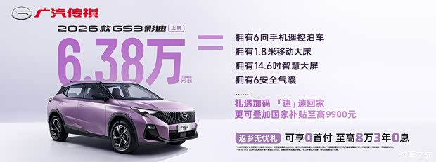 ★:26款传祺GS3影速0首付至高8万3年0息;
