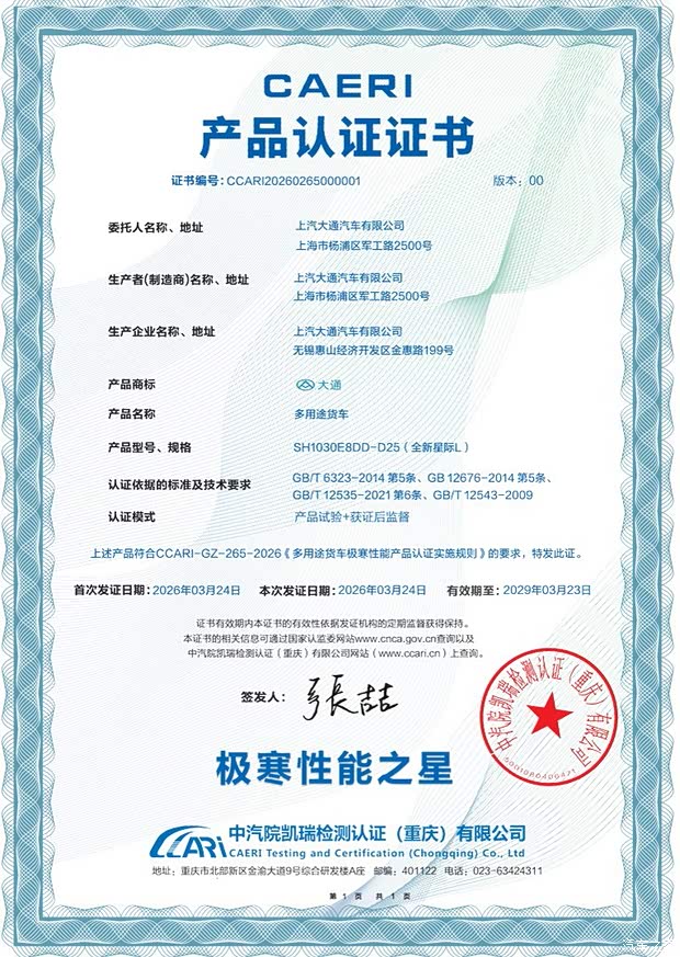 全新星际L搭载2.5T柴油动力,520N・m峰值扭矩、额定载重超过同级100%,轻松应对工程重载、农林长途运输。近日,在黑龙江黑河举行的2026(第四届)皮卡冰雪驾控体验营暨寒区越野挑战赛中,全新星际L成功完成四大维度极寒性能测试,获颁中国汽研《极寒性能之星》认证证书,以实测验证了其在极寒环境下的硬核实力。