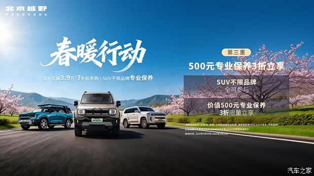 春风拂野,万物焕新。正值春日出行黄金季,北京越野重磅启动春暖行动,推出三重礼遇:国厂补双享至高3.9万、7年低息购、SUV不限品牌专业保养三折,涵盖BJ30旅行家、BJ40增程、BJ40燃油和BJ40探险家等多款车型,用实打实的福利优惠和全方位的服务保障,让更多消费者轻松拥抱美好出行生活。