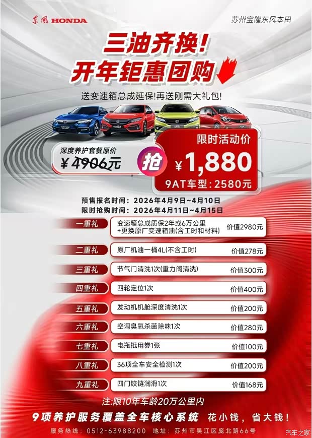 🚗苏州宝隆东风本田「三油齐换」开年钜惠团购来啦! 原价4906元深度养护套餐,限时1880元抢(9AT车型2580元) 9重好礼拉满,变速箱延保+原厂机油+全车检测全覆盖 花小钱,省大钱!10年车龄20万公里内可享 🏆全国十佳白金钥匙店 📍地址:苏州市吴江区庞北路66号 #东风本田 #汽车保养 #苏州车主福利
