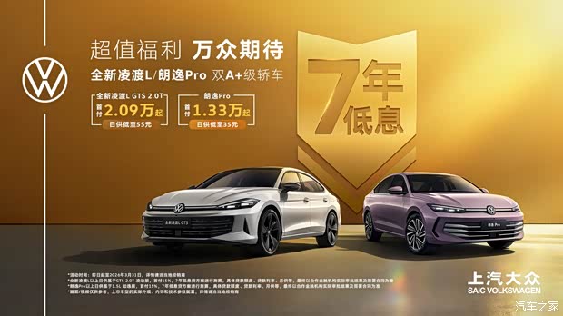在轿车市场,上汽大众则通过“双A+产品矩阵”持续强化竞争力。即日起至2026年3月31日,全新凌渡L与朗逸 Pro同步推出“7年低息”金融政策,进一步降低购车门槛:全新凌渡L GTS 2.0T版本首付2.09万元起,日供低至55元;朗逸 Pro首付1.33万元起,日供低至35元。其中,全新凌渡L以宽体轿跑设计、无框车门与掀背式尾门塑造个性化运动风格,GTS车型搭载EA888 2.0T高功率发动机,兼顾性能与驾控乐趣;朗逸 Pro则以更大空间、更高舒适性和更智能化体验持续巩固“国民家轿”地位,为家庭用户带来更具品质感的出行选择。(详情请洽当地经销商)