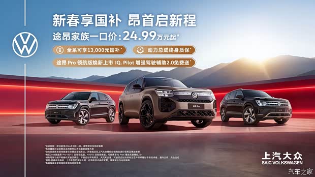 作为大众品牌旗舰SUV,途昂家族在这一轮政策中也展现出明显优势。置换购买途昂家族车型的用户,在至高13,000元国补基础上,还可叠加动力总成终身质保、至高5年0息金融政策以及原厂数字钥匙赠送等多重权益。值得一提的是,3月1日焕新上市的途昂 Pro 2026款450TSI四驱领航版,一口价29.99万元起,增配不加价。即日起至3月31日,购买途昂 Pro 2026款450TSI四驱领航版与2026款450TSI四驱登峰版的用户,还可免费享受IQ. Pilot增强驾驶辅助2.0,助力用户升级智能化的驾驶体验。