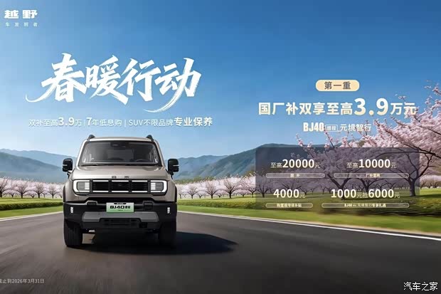 春风拂野,万物焕新。正值春日出行黄金季,北京越野重磅启动春暖行动,推出三重礼遇:国厂补双享至高3.9万、7年低息购、SUV不限品牌专业保养三折,涵盖BJ30旅行家、BJ40增程、BJ40燃油和BJ40探险家等多款车型,用实打实的福利优惠和全方位的服务保障,让更多消费者轻松拥抱美好出行生活。