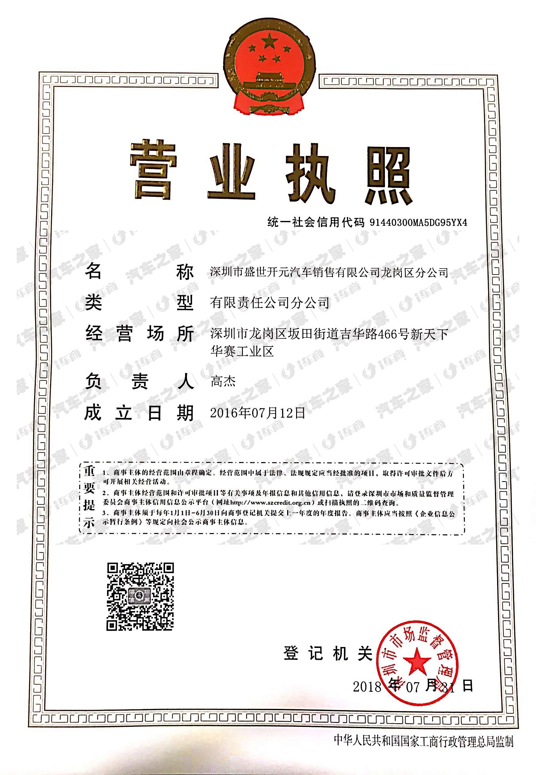 深圳市盛世开元汽车销售有限公司龙岗分公司,成立于2016年,位于深圳市龙岗区坂田街道吉化路466号 新天地华赛工业区内,是一家经营比亚迪全系车型的4S店。深圳盛世开元比亚迪坂田店隶属于比亚迪股份有限公司,是一家比亚迪厂家直营4S店。