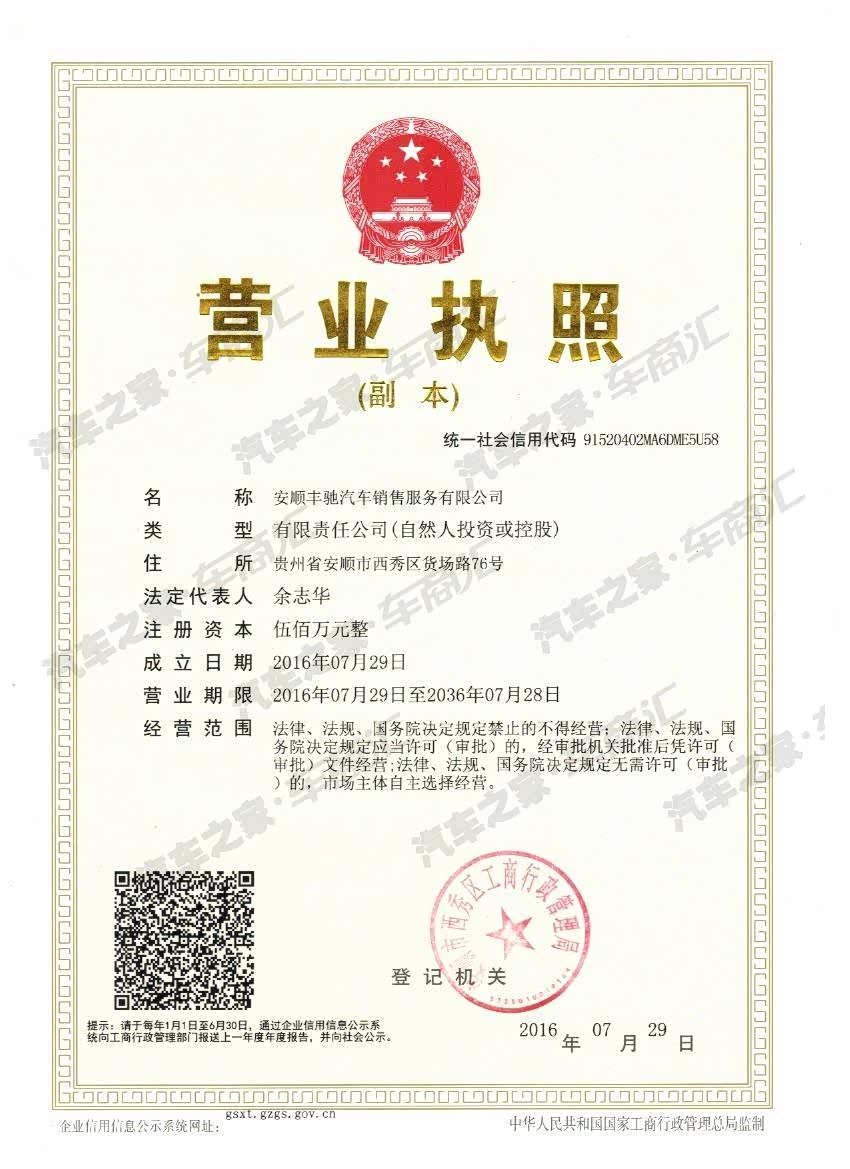 位于安顺市西秀区兴安大道两六路(恒信汽车城内),占地1000平方米,公司总投资500万元。公司始创于2016年7月,以整车销售、零配件供应、售后服务、信息反馈为经营主体。现有汽车销售人员和多年维修经验的技术人员近20人。
