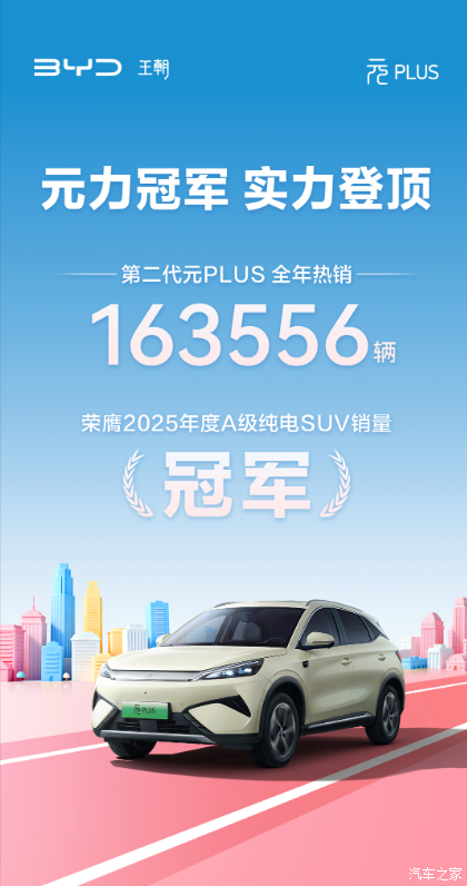 #第二代元PLUS#全年热销163556辆,拿下2025年度A级纯电SUV销量榜首! 这不止是一个数字,更是一份热爱,一份选择!凭借全球设计、全球标准、全球品质的硬实力,第二代元PLUS热销足迹编及全球116个国家和地区,让世界看见中国智造的年轻力量。 感谢每一位与第二代元PLUS同行的“元气青年”,我们一起用实力定义潮流,也让每一次出行都成为元气宣言!未来,我们将持续进化,为更多的用户带来更智能、更安全、更舒适的出行体验!