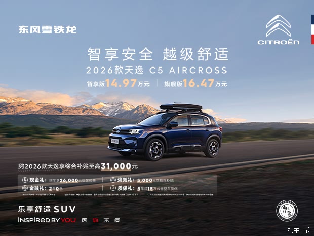 日前,东风雪铁龙旗下2026款天逸C5 AIRCROSS已于6月16日焕新发布。新车聚焦舒适与安全两大核心价值,进一步为都市新适代家庭带来更安心、从容的驾乘体验。