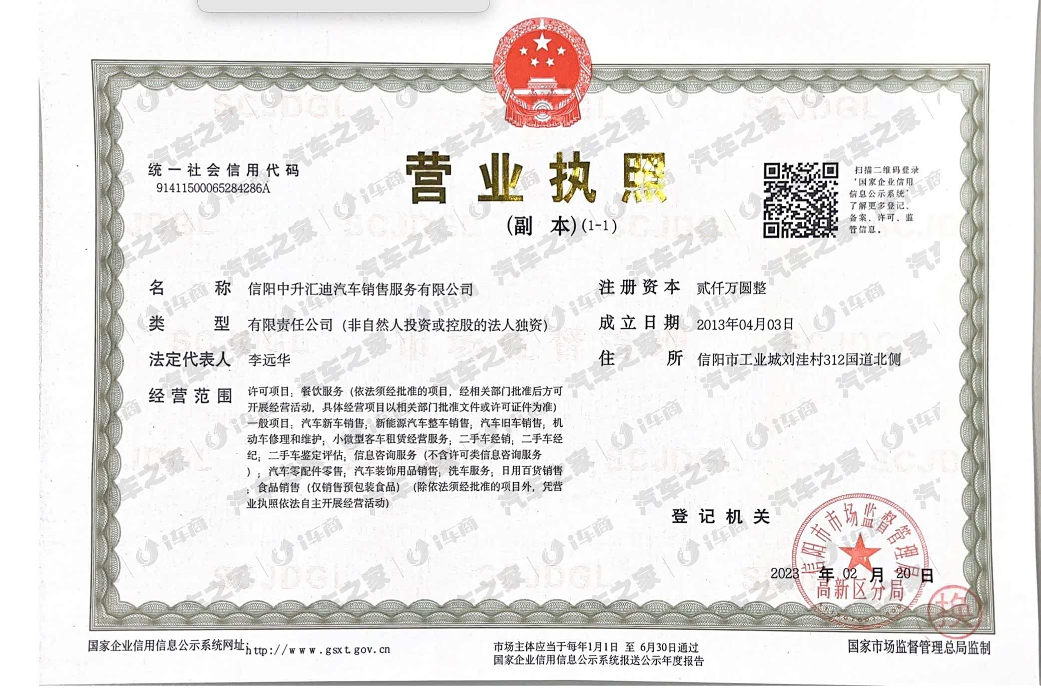 信阳中升汇迪汽车销售服务有限公司