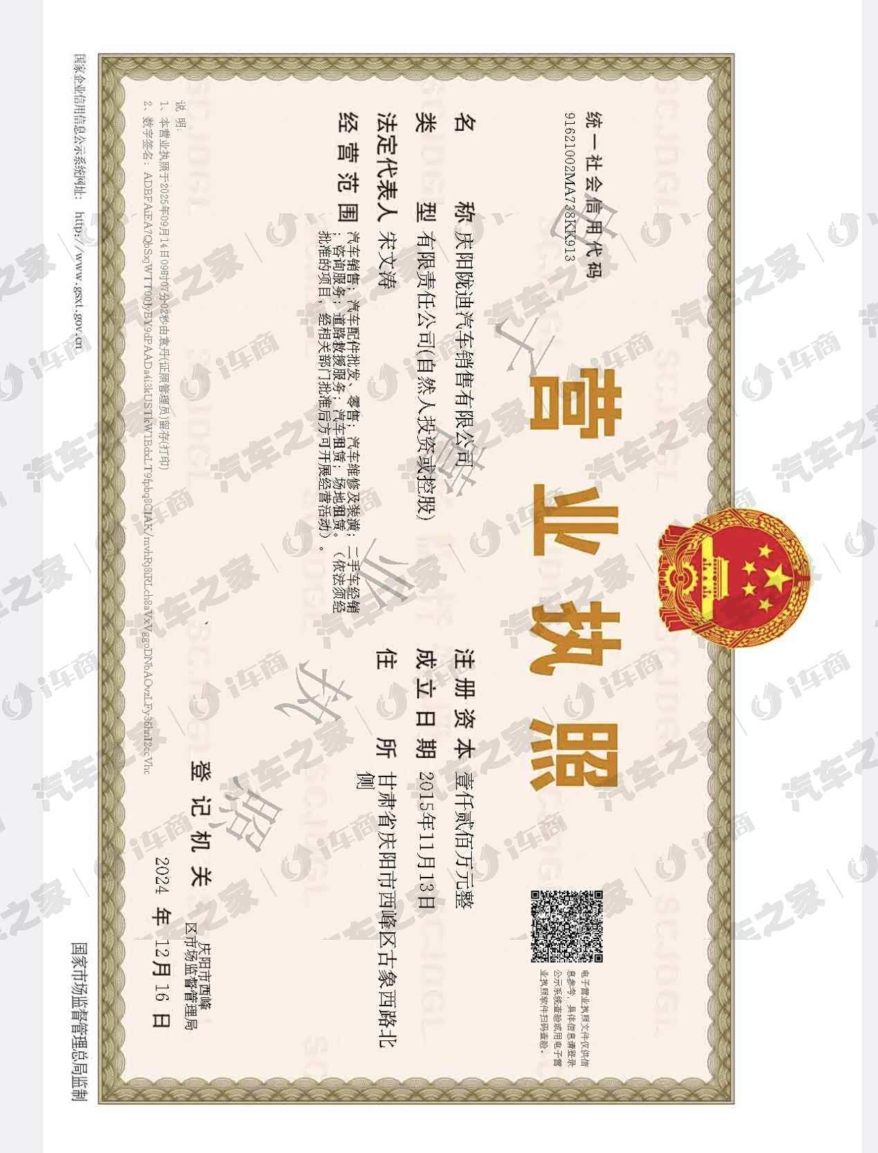 庆阳陇迪汽车销售有限公司成立于2015年11月13号,公司注册资金壹仟贰佰万元整,位于庆阳市西峰区古象西路北侧,是庆阳唯一一家比亚迪4s店以,主要经营项目有比亚迪汽车销售,比亚迪专车维修,我公司以客户满意为服务标准,建立了汽车售后服务、配件供应、信息反馈为一体的服务模式。公司主要做汽车销售、批发、汽车配件批发零售等,汽车维修及装潢。二手车经销等,自成立以来公司始终奉行“以质量求生产,以诚信求发展”的经营理念。坚持为每一位客户悉心服务,为客户提供专业的售后服务。