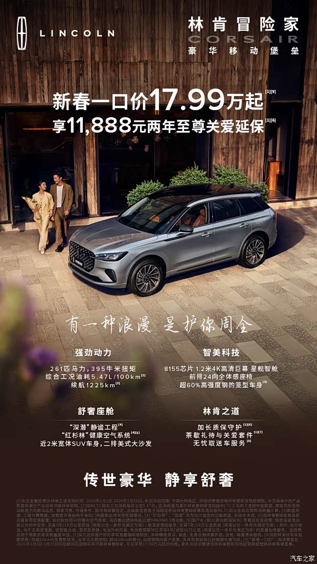 林肯冒险家新春一口价17.99万起,享11888元两年至尊关爱延保
