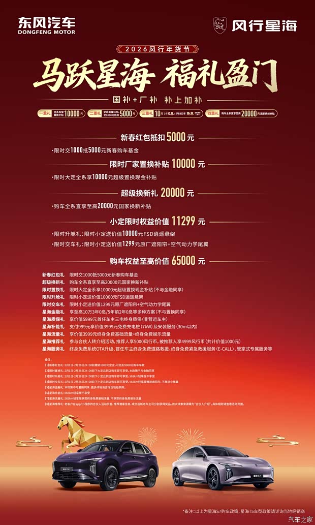 春风送暖,年味渐浓。东风风行诚意推出“风行年货节”主题盛典,以重磅“国补+厂补”双重福利,叠加多重新春尊享礼遇,让您在喜迎新春之际,轻松将“智美安心家轿”星海S7开回家。本次年货节旨在以实实在在的优惠与越级的产品力,陪伴万千家庭开启舒适、安全、高效的崭新旅程,共赴团圆。