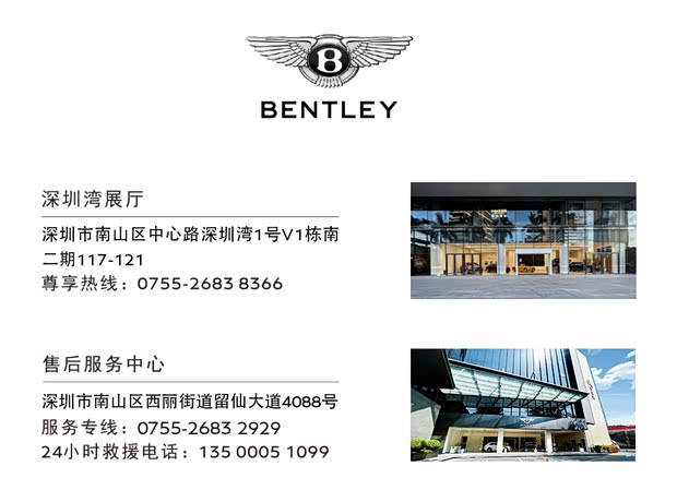 深圳湾展厅为客户提供尊贵、惬意的服务环境,让客户沉浸式感受宾利汽车独特的品牌文化。展厅设有个性化订制专区,在这里可以感受宾利精湛手工工艺与经典设计语言来获取专属定制灵感。 西丽售后服务中心拥有宾利官方认证的高级技师团队,配备精密齐全的电子检测设备,提供维修保养、原厂零件供应以及24小时紧急服务,全方位保障宾利座驾始终保持最佳性能,让客户切身感受宾利对工艺与材料不懈追求,体验其澎湃动力与奢华驾乘感受,了解宾利汽车传承不息的品牌精髓。