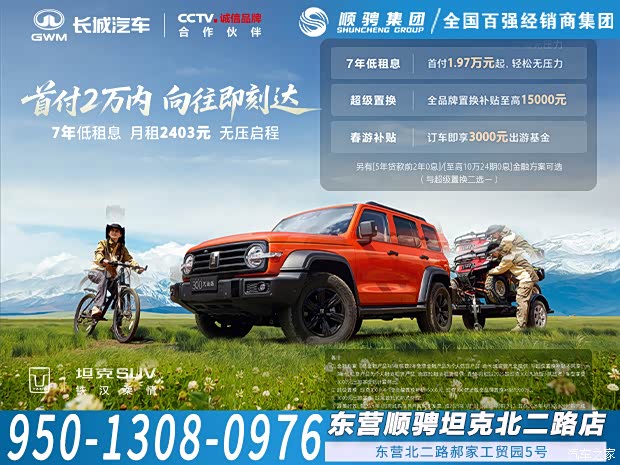 车源足、价格优,店内足不出户即可挂牌!购车按揭、保险、上牌等一站式服务;买车请认准顺骋坦克-东营顺骋店!店内多重豪礼等您来拿!