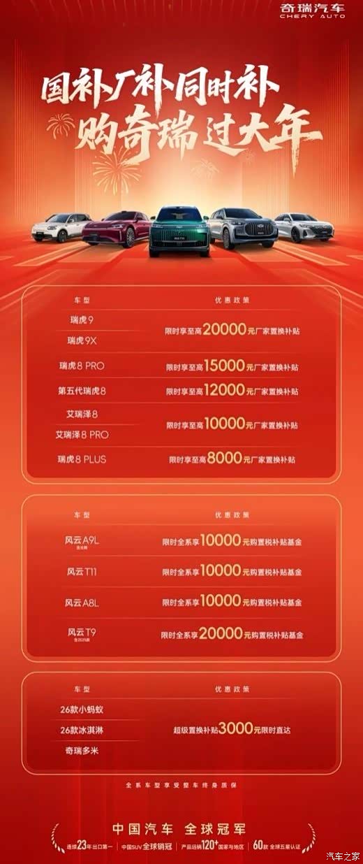 新年购车旺季,奇瑞汽车精准把握市场需求,重磅推出覆盖全品类车型的厂补政策,叠加国家补贴红利,构建起“双重补贴+全维保障”的购车优惠体系,为消费者献上新春购车厚礼。其中,艾瑞泽8家族专属至高1万元厂补的重磅福利,成为此次政策的核心亮点之一,尽显品牌对消费者的诚意。