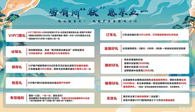 惠 享 五 一团购会活动政策十重礼遇VIP 门票99元=4980元旅游VIP卡+比亚迪王朝定制礼品+露营户外烤炉+置换补贴至高42000元+5轮循环抽奖+限时一口价+5888精品大礼包+砸金蛋100%中奖+大疆无人机一台