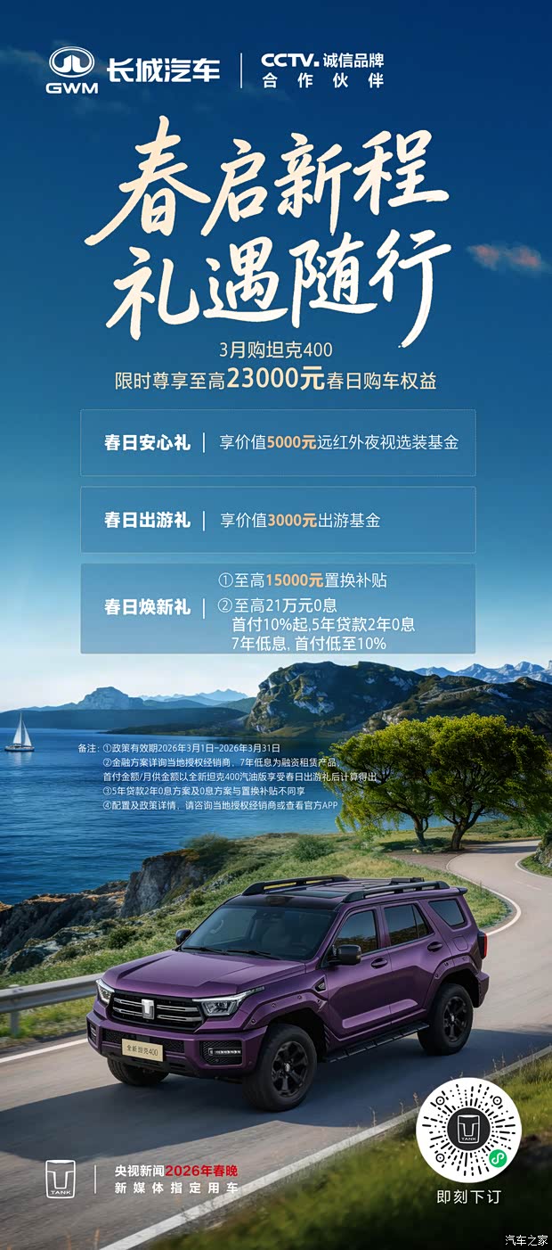 3月购坦克400 限时尊享至高23000元春日购车权益