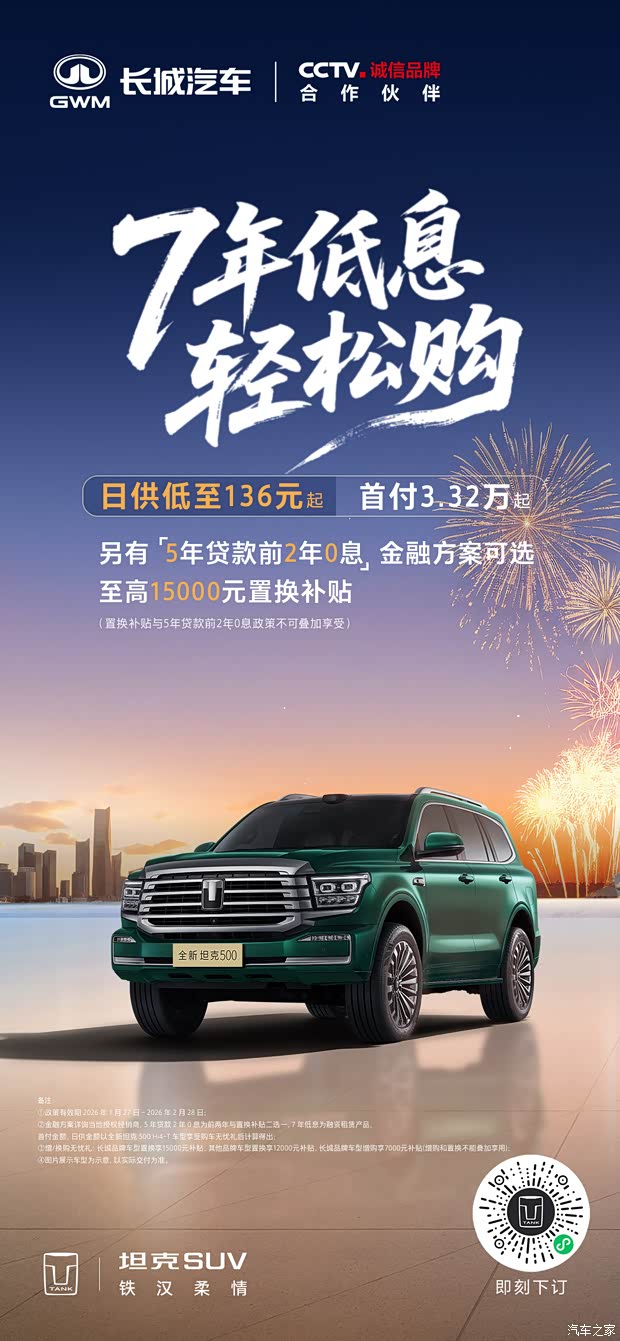 购全新坦克500享7年低息,日供低至136元起,首付3.32万起。