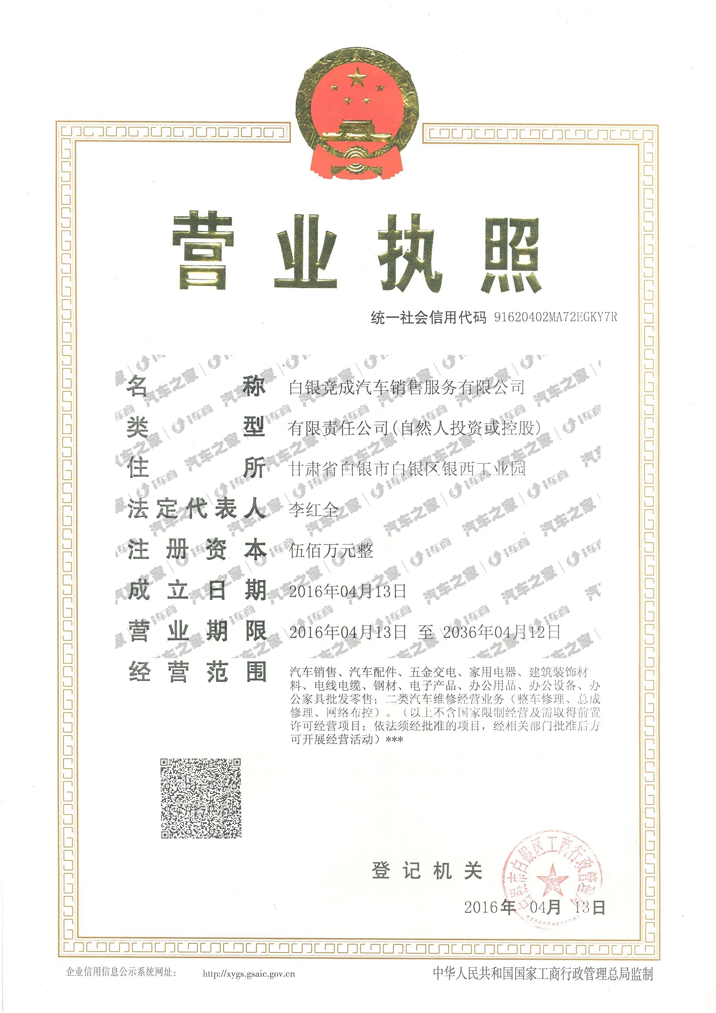 白银竞成汽车销售服务有限公司经长城(中国)汽车销售有限公司授权,成为白银地区唯一一家长城哈弗4S店。 哈弗SUV系列、皮卡等全系产品。办理汽车整车销售、信贷业务、车辆保险、挂牌业务、配件供应、维修服务、汽车装潢、二手车的评估、验证、回收、寄售、销售等一条龙服务! 公司完全按长城哈弗汽车全球统一标准,建立集整车销售、配件供应、维修服务和信息反馈为一体的4S服务中心,为客户购买与使用长城汽车哈弗品牌车辆提供了优质的保证,也使得更多的消费者能够亲身感受长城哈弗品牌的优秀品质。白银竞成坚持秉承“每天进步一点点”的文化理念,牢固树立起“诚信、责任、发展、共享”的核心价值观;以“精心对车、诚心待人”为服务宗旨,积极倡导“狼兔精神、团队精神”的群体意识;以“稳健务实”的工作作风开展各项工作。将依托长城汽车品牌及其先进的管理理念,竭诚为广大客户提供最细致、最周到的优质销售与售后服务 。白银竞成汽车销售服务有限公司于2016年5月代理长城哈弗汽车,注册资金500万元,总建筑面积达5000平方米,固定资产投入近2000万元,是一家具有综合能力的汽车专营企业,在业界具有很高的知名度。