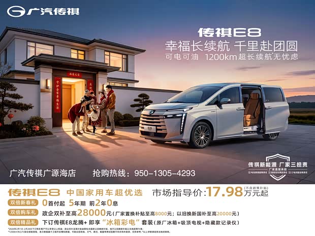 E8龙腾+:下订即享原厂升级“冰箱彩电套装(二排冰箱+吸顶电视+隐藏款记录仪) [金融礼】0首付起,5年期,前2年0息 三电终身质保(首任非营运车车主)、三电8年15万公里质保(非首任车主、非营运车)、3年11万公里整车质保(非营运车) [金融礼】0首付起,5年期,前2年0息 三电终身质保(首任非营运车车主)、三电8年15万公里质保(非首任车主、非营运车)、3年11万公里整车质保(非营运车) [幸福专享“置换礼”】置换补贴8000元