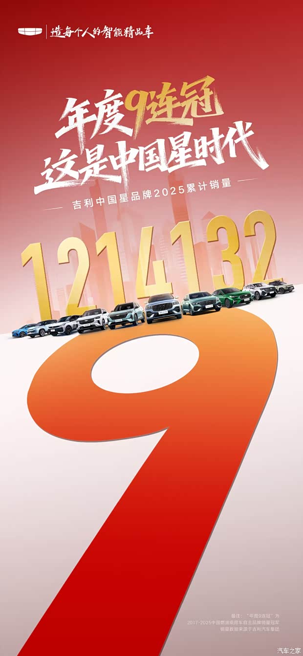 2025年车市收官战报出炉,吉利燃油车板块再度刷新行业标杆——吉利中国星品牌2025全年累计销量达1214132辆,成功斩获2017-2025年中国燃油乘用车自主品牌年度销量9连冠,以优势稳固了在燃油车市场的领军地位。