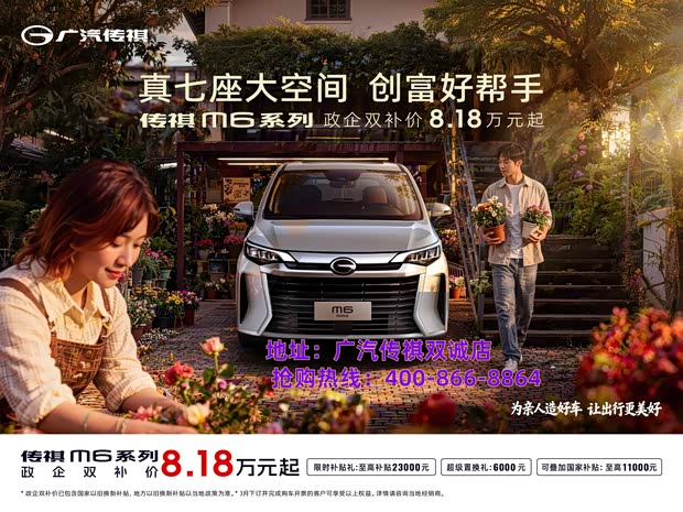 传祺M6 购车直享补贴至高2.3万+置换还补至高6000 全新设计、 超级宽享空间、 舒适座舱畅行、华为Hicar 智能手机互联系统。 限时补贴礼:至高补贴23000元 以旧换新补贴加码:传祺加码置换补贴至高6000元 【老友管家礼】祺行无忧基金双倍膨胀权益