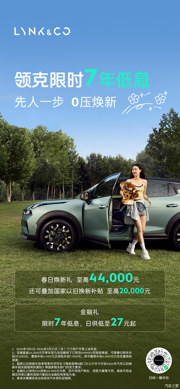 春日焕新,正好出发。🌸 领克限时7年低息,日供低至27元起。 至高44,000元焕新礼 压力小一点,梦想近一点。 👇扫码,开启你的0压购车体验。 #领克新能源|广西沃之悦|南宁领悦|南宁领航|南宁领尚|南宁领创|南宁领智|北海吉悦行 领享re线☎0771-3865588