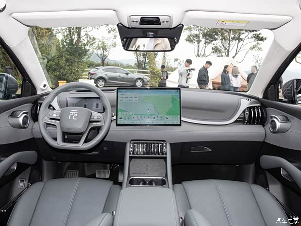第二代元PLUS智驾版延续龙颜美学设计,前脸下包围调整,全新几何结构设计,轮毂全新设计,提供17英寸、18英寸两种尺寸,同时新增全新“乐动米”车色,更青春时尚;内饰质感全面提升,软包覆盖面积大量增加,新增“暮云灰”内饰主题,全系采用电子怀挡式换挡机构,前排中央扶手区域新增智能车载冰箱,实现A级纯电SUV首搭,全车24处储物空间,新增主驾侧眼镜盒,后排座椅下方提供抽屉式储物空间,每个达到7.1L容积,增加了实用性。后排座椅放倒,后备箱空间可达到1338L,第二代元PLUS智驾版全系搭载智能座舱高阶版DiLink100车机,15.6英寸中控大屏,5G芯片,算力升级,响应速度更快,支持四音区识别、连续指令。此外还配置8.8英寸液晶仪表、W-HUD抬头显示、50W手机充电、ETC装置等,功能丰富实用。全系搭载天神之眼C-高阶智驾三目版,29个感知硬件包括3前颗视摄像头、5颗周视摄像头,4颗环视摄像头、5颗毫米波雷达,以及12颗超声波雷达,入门即享高快领航、全场景泊车,并且开启智驾时后视镜会亮起蓝光。安全方面,新车还支持AEB、DMS驾驶员监测等,提升主动安全性。标配7安全气囊,同级少有的前排远端气囊,可以有效减少二次伤害。车身高强度钢占比85%,超高强度钢占比55%,最高1500Mpa强度,将安全性拉满