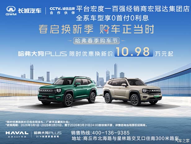 哈弗大狗PLUS焕新上市,增配不加价,现在购车可享18000元现金优惠,更有至高8000元置换补贴、限时优惠换新价10.98万元起,另享金融礼、网联礼、质保礼多重壕礼: