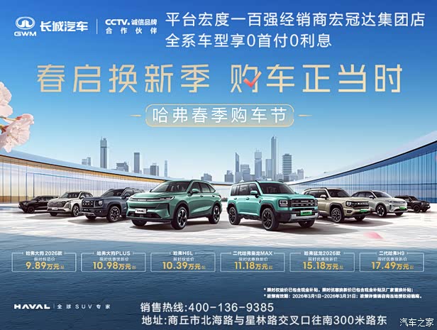 【商丘平台宏度】降价潮来袭,一降到底,买车趁现在,哈弗H6上市13年,单品月销超8万、连续5年全球SUV影响力排名TOP10,400余万国民信赖口碑。欢迎到店赏车!购车正当时,福利再加码,本地客户专车接送,外地客户报销路费、餐费、住宿费。