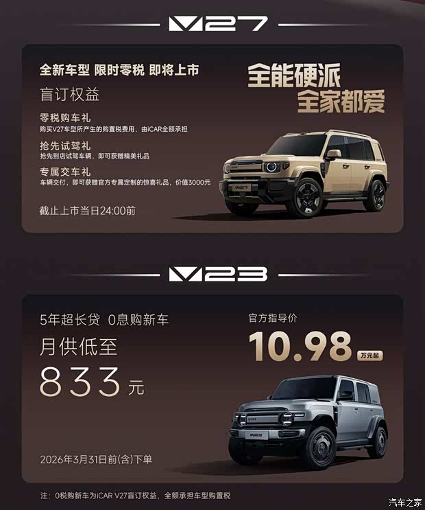 在iCAR的产品矩阵中,V27与V23如同双子星,分别照亮家庭与个性两大细分市场。它们共享方盒子基因与硬核品质,却又以截然不同的产品特性回应不同人群的内心渴望。3月,两款车型客户权益同步升级,让选择变得更加超值。