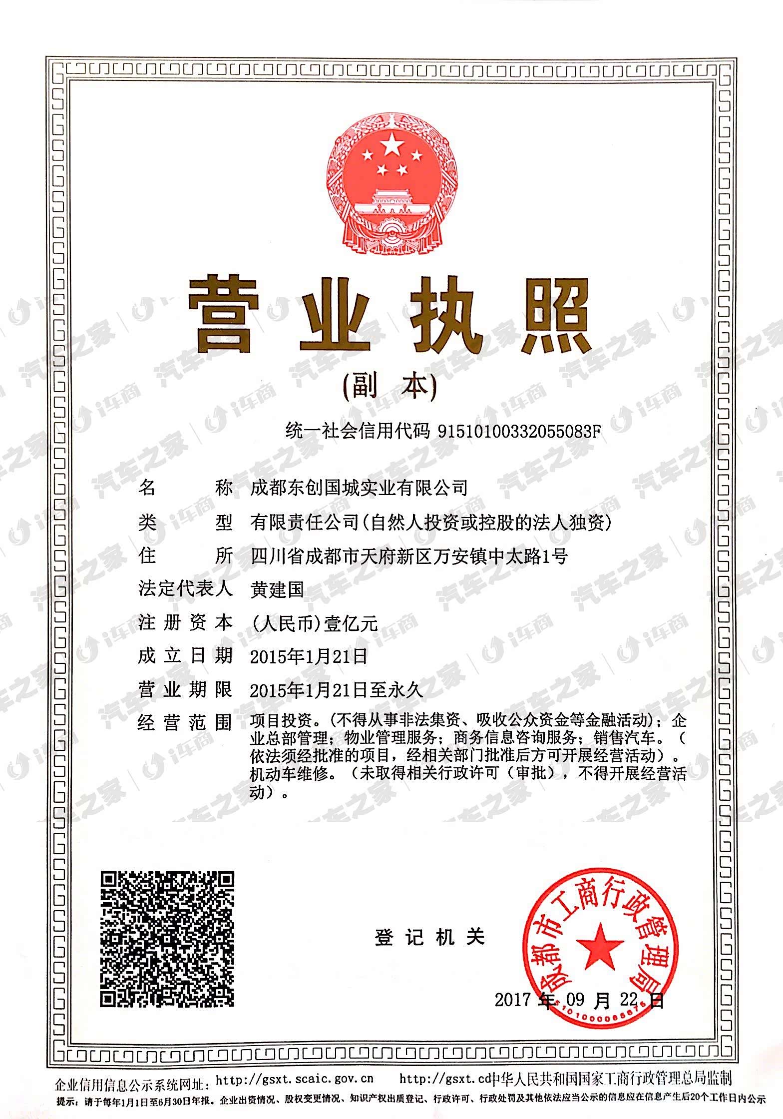 成都东创国城实业有限公司隶属于成都建国汽车贸易有限公司,成立于1997年,立足四川,专注汽车服务领域,代理20多个汽车品牌,拥有20几个汽车文化产业园区、260多家品牌4S店,近万员工及100万客户资源数据库,现已成为西南最大的汽车销售服务集团,并以完善的服务网络、创新的营销模式、独特的文化理念立于车市,影响中国。