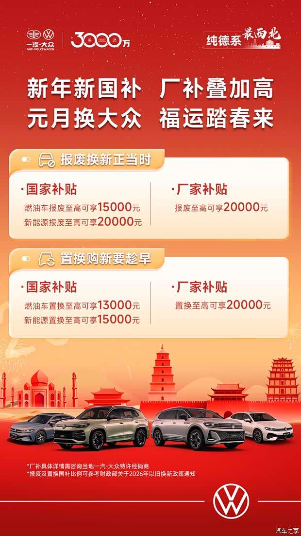 2026年汽车以旧换新,政策出新规啦!一汽大众诚意跟进,旧车置换新车都有补贴,叠加一汽大众厂家补贴至高可补35000元,早定早提车,1月到店还能解锁额外进店礼,地址:奎屯市南环西路118号,检查站旁, 进店了解详细政策吧!