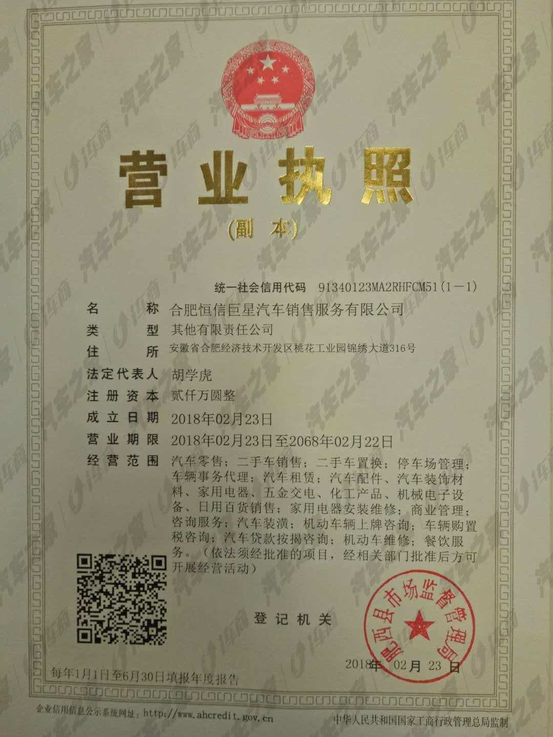 合肥恒信巨星汽车销售服务有限公司隶属于恒信汽车集团。恒信汽车集团,连续多年荣获“中国汽车流通行业杰出贡献奖”、“中国汽车流通行业企业品牌具影响力奖”、“中国汽车流通行业卓越贡奖”及“社会责任公益奖” ,年销售收入超过800亿元,中国汽车经销商集团百强排名第五名,中部地区第①,位列中国企业500强第297位、中国民营企业500强第127位、湖北省前三。