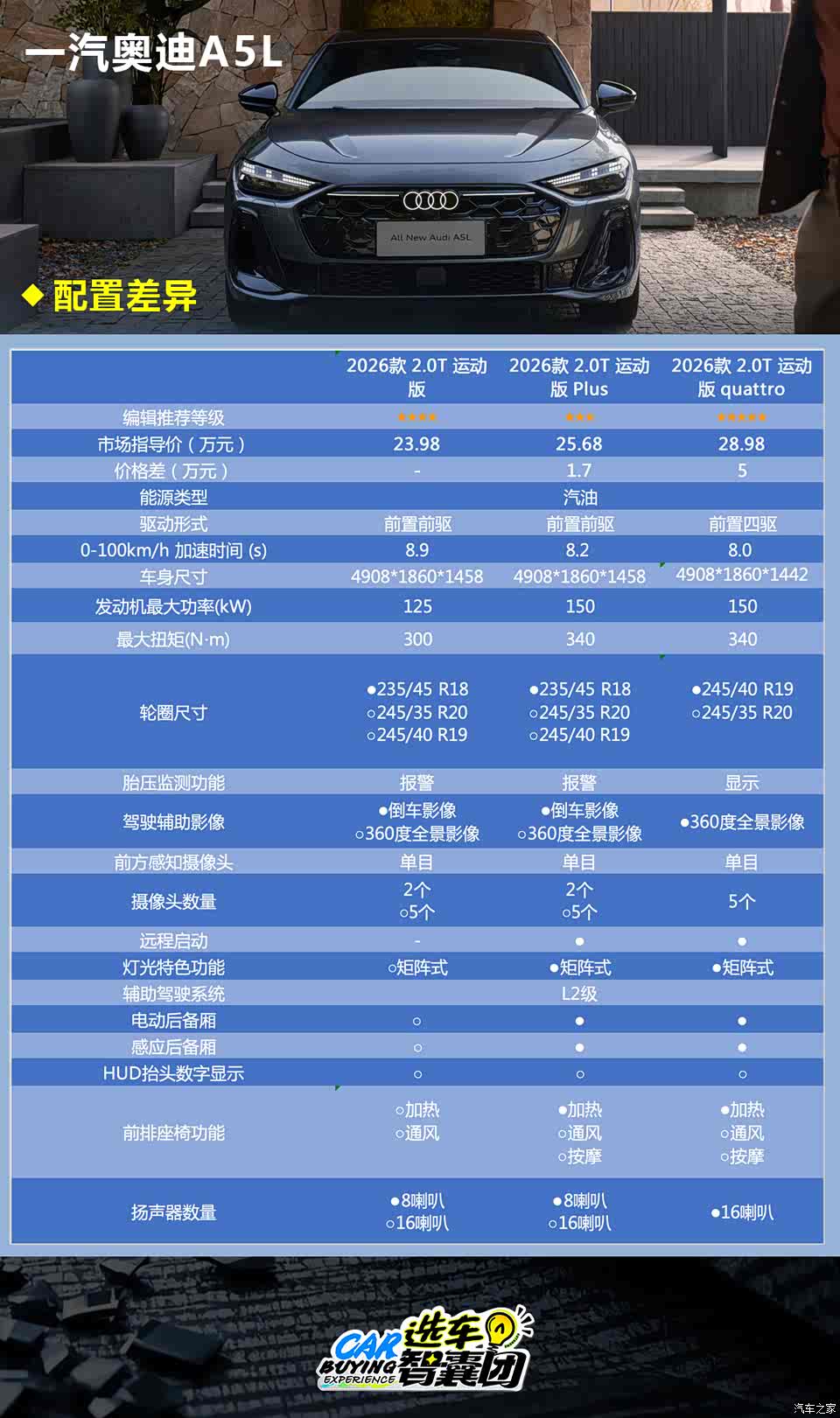从目前发布的车型来看,入门版运动与运动PLUS价差1.7万元,但实际配置差距不是很大,且多数配置差异都能通过选装获得,不过需要注意的是,入门版车型虽然也采用2.0T发动机但是最大功率只有125kW,中配车型发动机最大功率为150kW,而从官方0-100km/h加速差值来看,个人认为不值1.7万。所以如果纠结于这两款车型的朋友,建议选择入门版本,配置也可根据自己需求而定。如果对速度、驾控有需求,建议直接加5万元上四驱版本,不仅多了四驱系统,同时在配置上也有不小的提升。