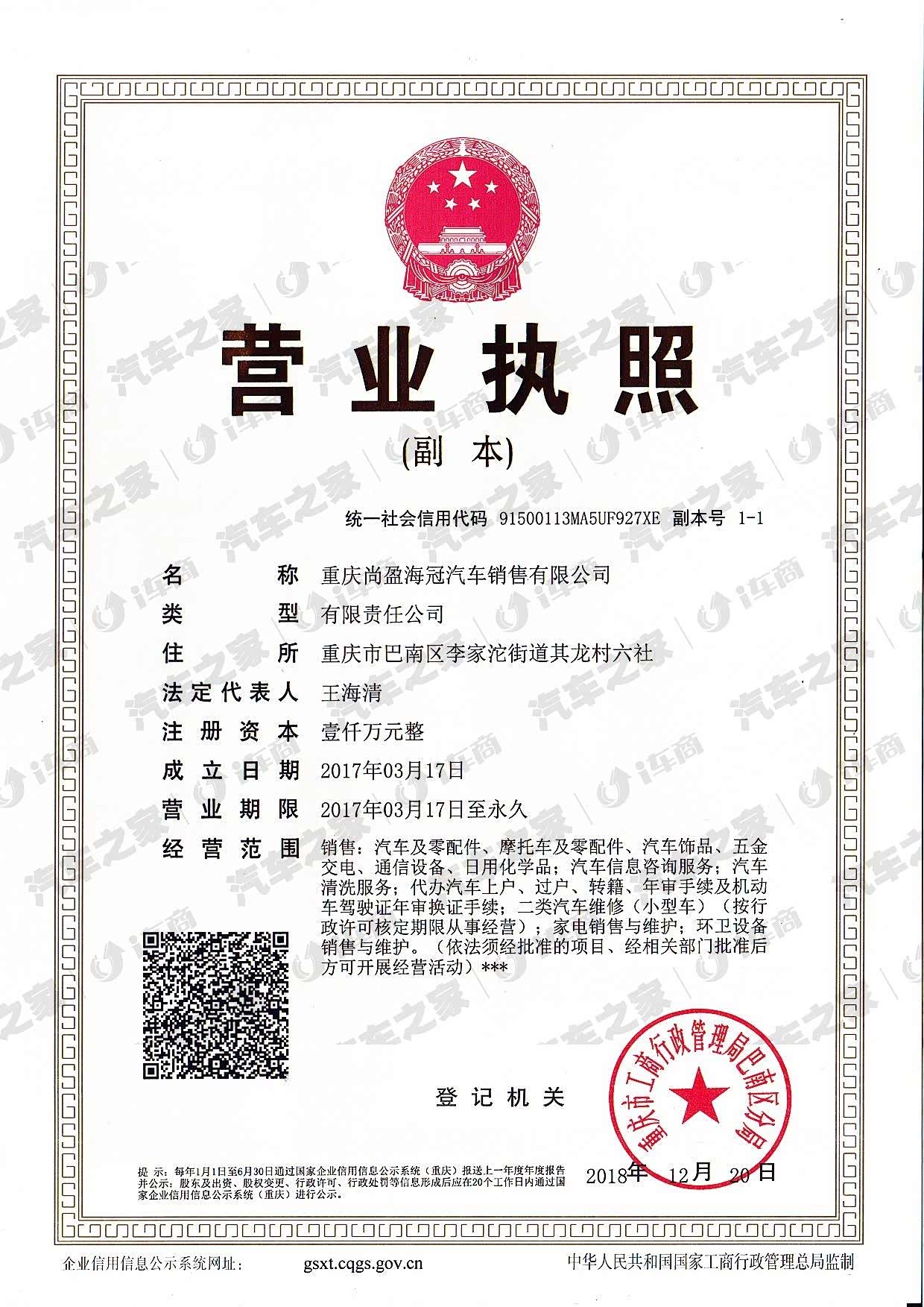 重庆尚盈海冠汽车销售有限公司,成立于2017年3月,注册资本1000万元,位于重庆市巴南区八公里轻轨站3号出口下。地理位置优越,交通便利。是一家专门从事比亚迪品牌汽车销售、维修、零配件供应优质企业。我们拥有优秀的销售团队,为客户提供优质的购车咨询服务及购买体验。