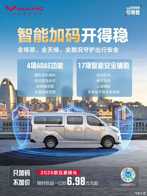 智能新加码,隐患无处藏 6座客车版440km可选智能选装包 4项ADAS功能+17项智能安全辅助 21项智能安全配置供选择 全场景、全天候、全路况 全面守护出行安全 限时预售权益现已开启 现在下订优享多重好礼! #26款扬光焕新预售 #只加码不加价