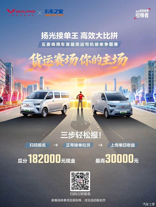 货运赛场,上场即主场! 沉淀多年的货运实力,是时候上场秀一把了! 所有品牌司机均可参赛! 五菱商用车首届货运司机接单争霸赛 招募正火热进行中 182000元现金奖池,最高30000元! 三步轻松报,接单就能赢大奖! 参赛具体事项及规则等详见活动报名页面