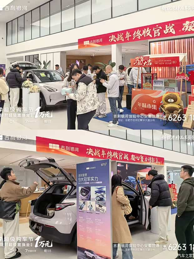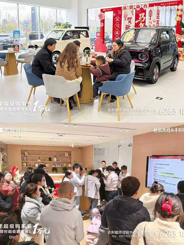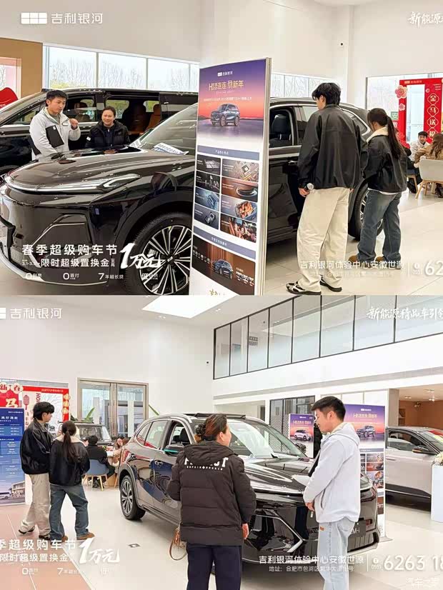 吉利银河体验中心(安徽世源店)“新年第一团购会”活动火爆进行中,现场人气爆棚,看车、试驾、咨询络绎不绝。